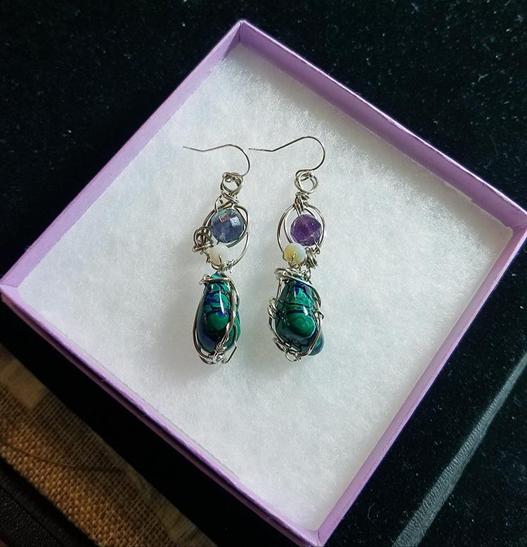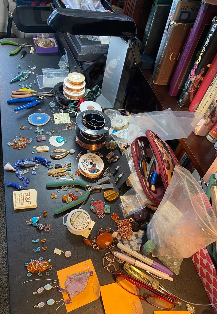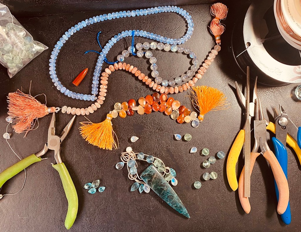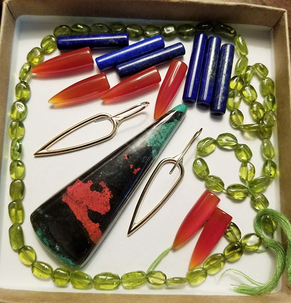 Two weeks ago I ordered more gold, silver, and copper wire, carnelian, lapis lazuli, bloodstone, peridot and other glorious semi-precious gemstones. This is just a peek at what is a large box full. Now it’s time to design! There’s nothing quite like gathering my tools, lights, stones and wire to create again!