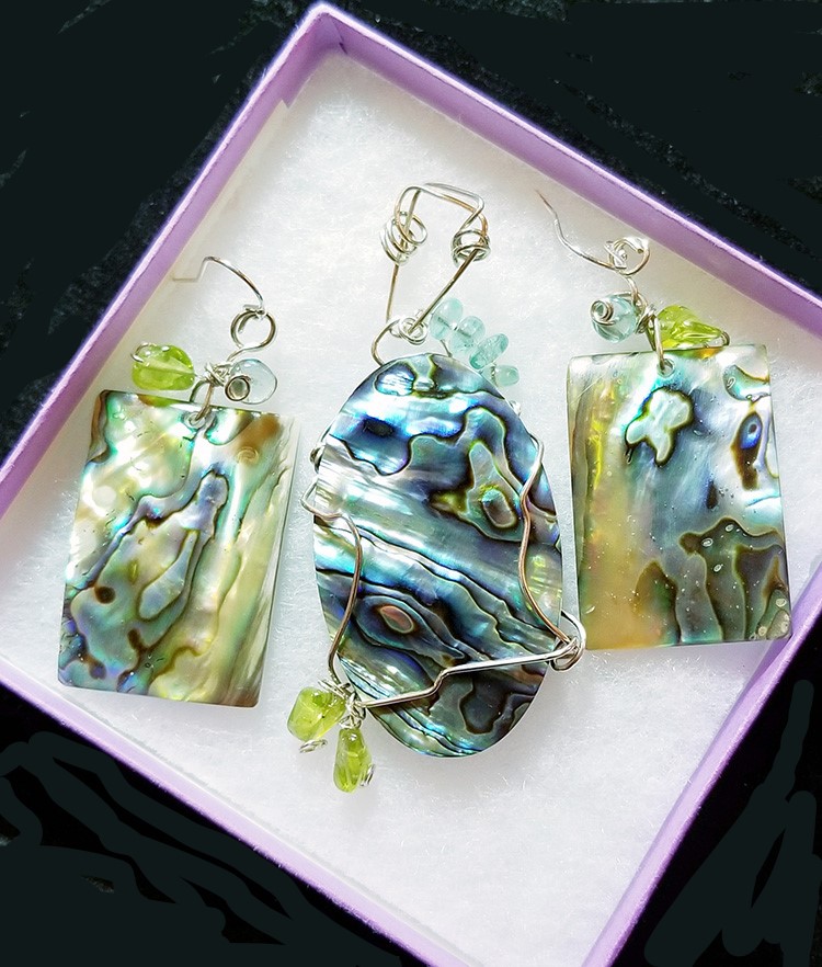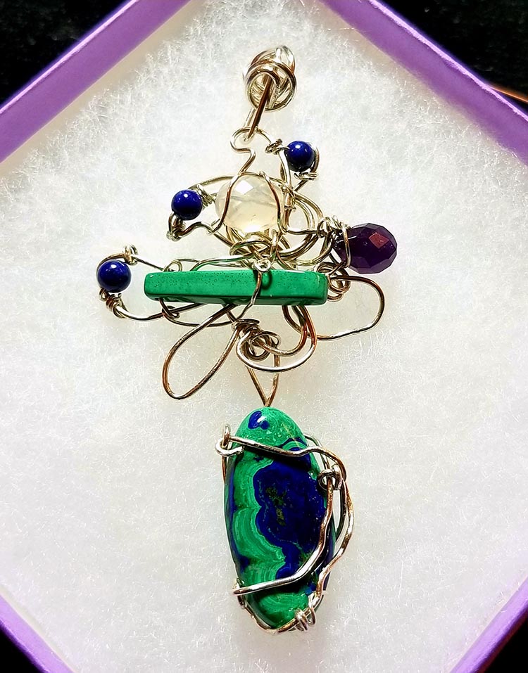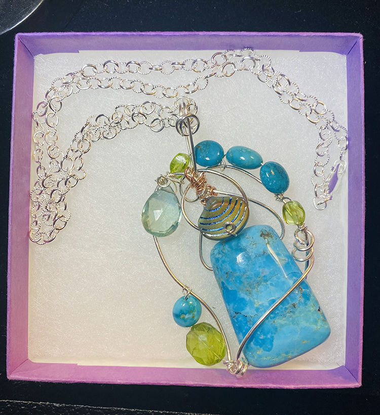 Recently I was invited to donate a pendant to the Bloomkidz Gala in Phoenix, which benefited children with autism and other related neurodevelopmental issues. This piece designed in silver and copper features turquoise, faceted peridot and a AAA blue fluorite, along with a small designer shell.