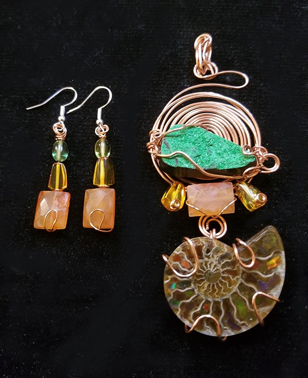 This lovely prehnite, black tourmaline and golden opal choker designed in glowing copper recently traveled across Tennessee with a dynamic woman who loves the arts! She’ll find new friends who move across a crowded room to meet her. The open front design is so easy to wear. And the gemstones speak in tones that gemstone lovers hear and enjoy! Next up, designing the earrings that match the choker! #Love rocks #Love art jewelry #Love designing
